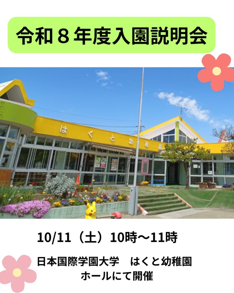 令和8年度入園説明会 おひさまクラブ 期日 2025年10月11日(土) 開催時間10:00 〜 11:00内容日本国際学園大学はくと幼稚園の入園説明会を行います。 入園についての説明、資料・入園願書の配布があります。対象年齢令和5年4月2日~令和6年4月1日生まれ対象クラス2歳毎日クラス・満三歳児クラスお知らせ年少、年中、年長ともに若干名の募集になります。入園をお考えの方は、ご参加いただけます。 ご予約はこちらから