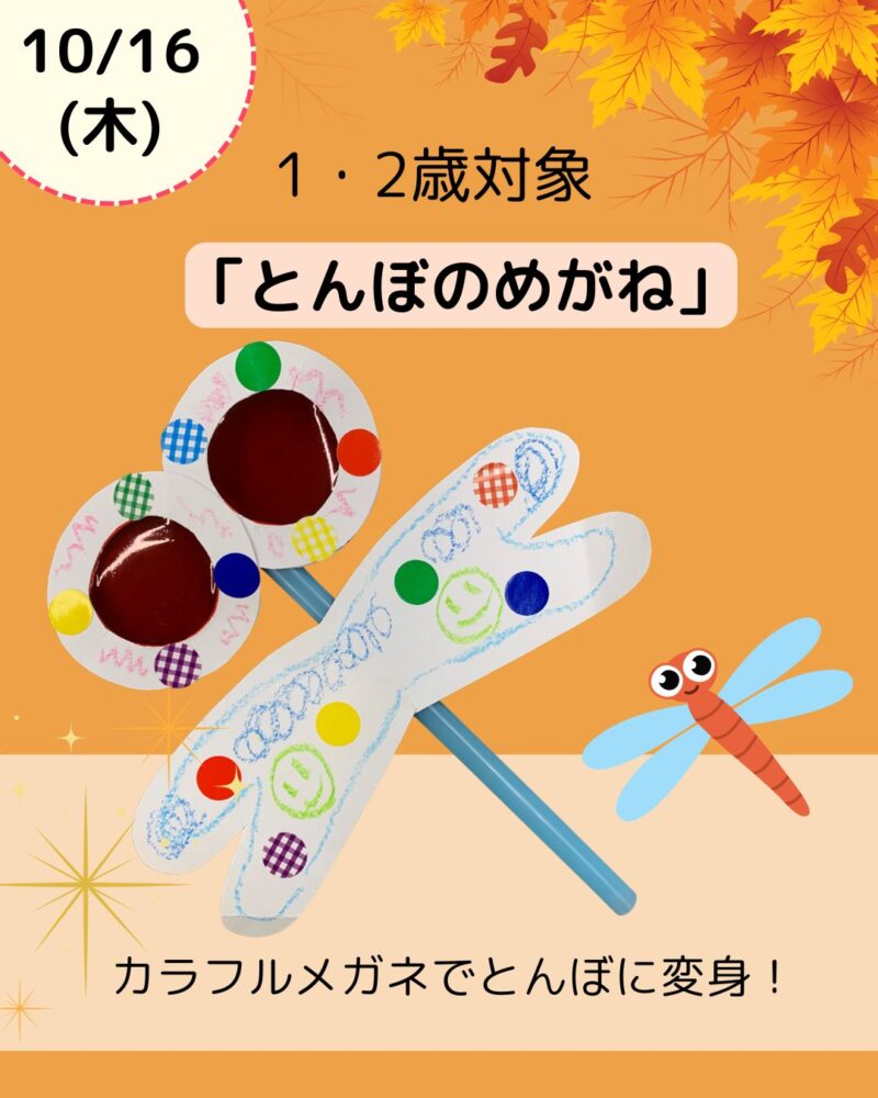 1・2歳「とんぼのめがね作り」 おひさまクラブ 期日 2025年10月16日(木) 開催時間9:30~11:30内容10:40~11:00 とんぼのめがね工作先生のコメントとんぼの羽に模様を描いたり、シールを貼ったりして作ります。 オリジナルのとんぼのめがねを付けて、とんぼになりきってごっこ遊びをします。持ち物水筒・おむつ・帽子等、必要な物をお持ちください。参加費無料※初回のみ:登録保険代250円(年度更新) ご予約はこちらから