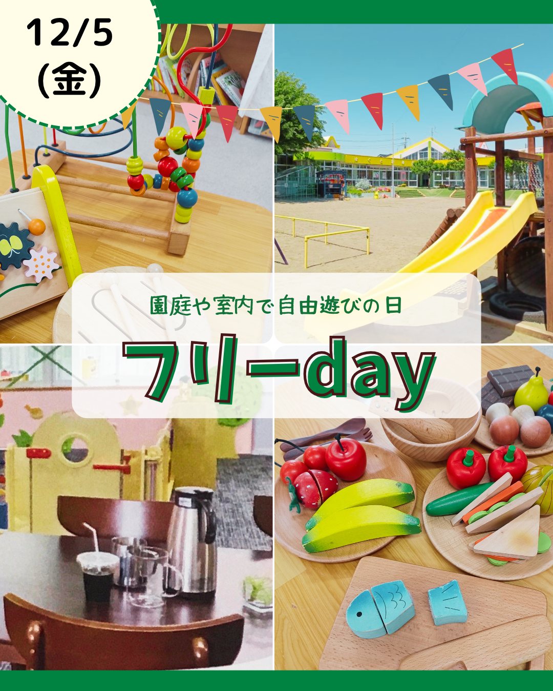 フリーday おひさまクラブ 期日 2025年12月5日(金) 開催時間9:30~11:30内容9:30から自由遊び(園庭開放・室内遊び)時間内はカフェが楽しめます。先生のコメントフリーdayは、園庭に出たり室内遊びをしたりなど、子どものやりたいことをめいいっぱい楽しみます。持ち物水筒・おむつ等、必要な物をお持ちください。参加費無料※初回のみ:登録保険代250円(年度更新) ご予約はこちらから