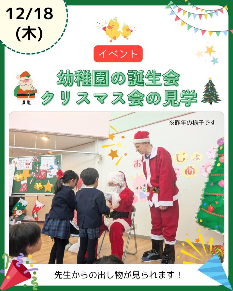 誕生会・クリスマス会見学 おひさまクラブ 期日 2025年12月18日(木) 開催時間9:30~11:30内容幼稚園の誕生会・クリスマス会を見てみよう先生のコメント先生からの出し物が始まりましたら、ご案内します。12月はサンタさんが来てくれるかもしれませんよ~!持ち物水筒・おむつ等、必要な物をお持ちください。参加費無料※初回のみ:登録保険代250円(年度更新) ご予約はこちらから